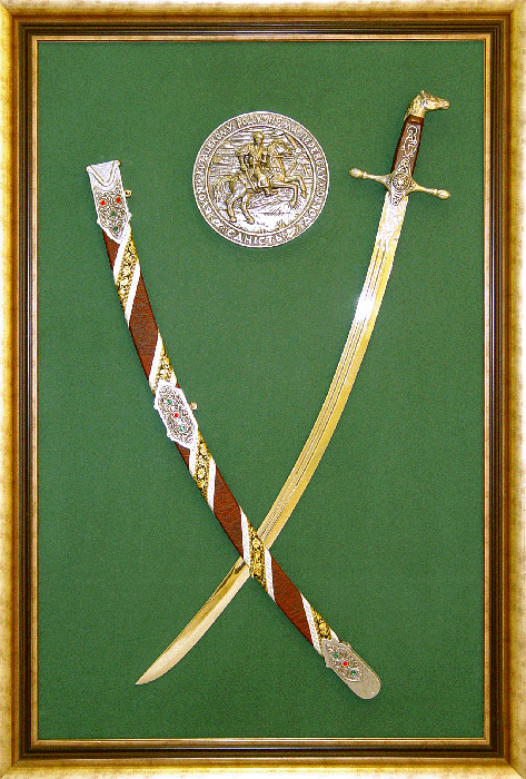 Геральдическая символика: настенные панно в изящных рамах, копии живописных произведений в технике гальваники;