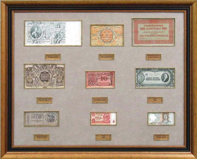 Настенное панно с оригиналами банкнот Украинского государства 1917-1922 годов;